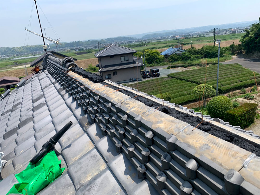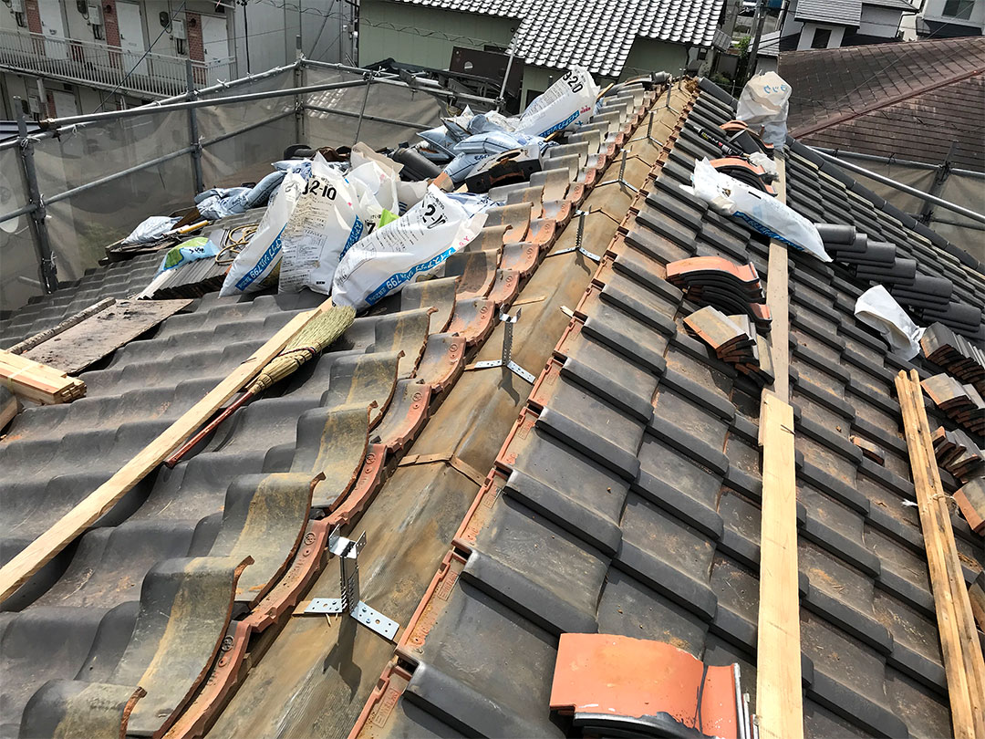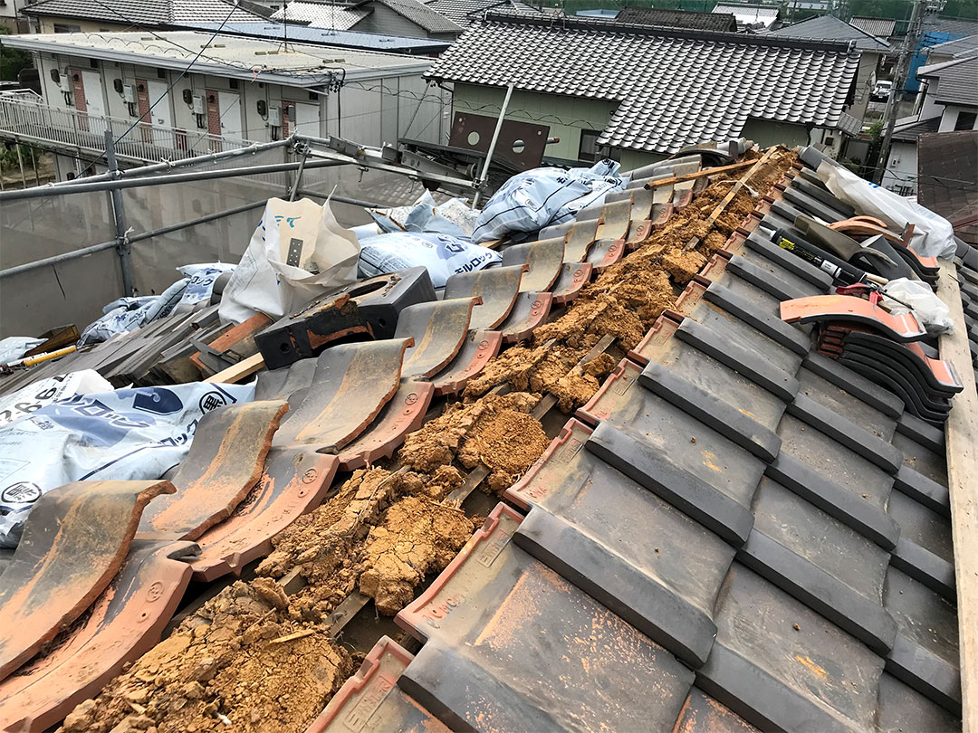 瓦屋根の建築物の工法は、土を敷き詰めた上に瓦を乗せているため多量の土が出てきます。ホコリを立てないよう行います。